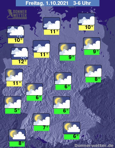 In der Nacht zum Freitag ist der Himmel über der Südosthälfte des Landes aufgelockert bis stark bewölkt, weiter nach Nordwesten hin bleibt die Wolkendecke hingegen weitgehend geschlossen. Vom Niederrhein, über das Emsland und im Nordseeumfeld fällt zeitweise Regen, im übrigen Bundesgebiet bleibt es trocken. Die Temperatur sinkt auf 12 Grad in Münster und bis 5 Grad in Saarbrücken.