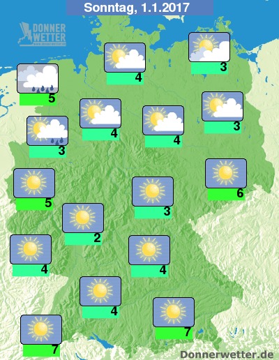 Am Neujahrstag scheint von der breiten Landesmitte bis in den Süden Deutschlands verbreitet die Sonne bei höchstens lockerer Bewölkung. Mehr und zunehmend auch dichte Wolken ziehen über den Norden und Nordwesten des Landes hinweg. Vom Niederrhein bis nach Schleswig-Holstein kann es zum Abend hin auch regnen, im übrigen Bundesgebiet bleibt es weitgehend trocken. Die Temperatur steigt auf 2 Grad am Westerwald und bis 7 Grad im Breisgau.