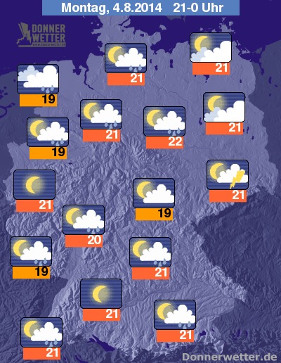 Am Abend bleibt es weiterhin überwiegend gewittrig und es bilden sich weitere Schauer und Gewitter. Deutlich freundlicher wird es im Westen und gebietsweise auch im Süden, hier reißt der Himmel auf und nachfolgend bleibt es auch trocken. Die Abendtemperatur liegt bei meist schwülwarmen und sehr einheitlichen Werten zwischen 22 und 19 Grad.