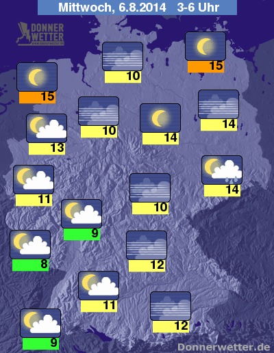 In der Nacht klingen auch die Schauer im Südosten ab, jedoch sind im äußeren Osten weiterhin einzelne Schauer möglich, sonst ist der Himmel aber verbreitet aufgelockert bewölkt oder auch klar und es bleibt trocken. Regional bildet sich Nebel oder Hochnebel. Die Temperatur sinkt auf 15 Grad an der Müritz und etwa 8 Grad am Pfälzer Wald.
