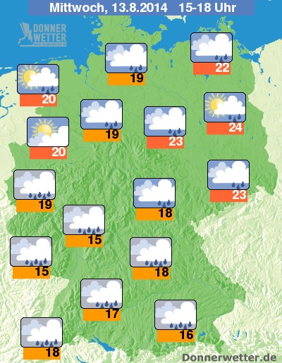 Heute Nachmittag ziehen verbreitet dichte Wolken durch, dazu fällt besonders im Stau der Alpen zum Teil langanhaltender und ergiebiger Regen, in der Nordhälfte bilden sich zeitweise Schauer. Die Sonne kann sich am ehesten noch im Norden gelegentlich zeigen. Die Temperatur liegt bei kühlen 15 Grad im Pfälzer Wald und wärmeren 24 Grad in Berlin.