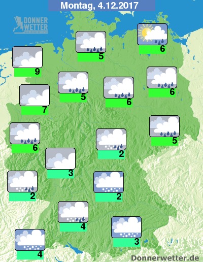 Heute halten sich überwiegend dichte Wolken, Auflockerungen sind vor allem an der Ostsee, hier und da auch im Westen und Nordwesten möglich, hier bleibt es auch die meiste Zeit über trocken. Im übrigen Bundesgebiet fällt hingegen zeitweise Regen, nach Süden hin meist Schneeregen oder Schnee, dazu besteht Glättegefahr! Die Temperatur erreicht 2 Grad in Mittelfranken und bis 9 Grad in Wilhelmshaven.