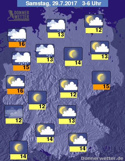 In der folgenden Nacht ziehen dichte Wolken mit Regen über das nördliche NRW, Niedersachsen, Schleswig-Holstein und zum Morgen hin auch über den Nordosten der Republik hinweg. In den anderen Landesteilen zeigt sich der Himmel dagegen oft nur locker bewölkt oder sogar sternenklar, dazu bleibt es trocken. Die Temperatur sinkt auf 16 Grad in der Kölner Bucht und bis 12 Grad im Saargau.