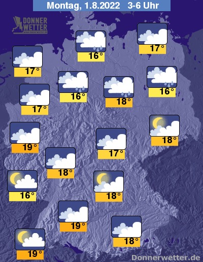 In der bevorstehenden Nacht zeigt sich der Himmel im Südwesten häufig nur locker, sonst jedoch überwiegend stark oder dicht bewölkt, dazu fällt vor allem über der Nordhälfte gebietsweise Regen, sonst sind nur lokal Regenfälle möglich. Die Temperatur sinkt auf milde 19 Grad in Stuttgart und etwa 16 Grad in Hamburg.