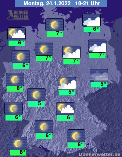 In der Nacht zum Dienstag ist der Himmel verbreitet sternenklar, hier und da bildet sich jedoch Nebel. Es bleibt überall trocken bei Tiefstwerten von 3 Grad in Cuxhaven und bis -3 Grad in Augsburg.