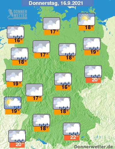 Heute ist es verbreitet stark bis dicht bewölkt, vor allem über der Südosthälfte fällt zunächst noch häufig Regen, der im Tagesverlauf jedoch immer weiter nach Südosten hin abzieht. Weiter nach Nordwesten hin bleibt es im Anschluss weitgehend trocken. Die Temperatur steigt auf nur 16 Grad im nördlichen Emsland und bis 22 Grad in Oberbayern.