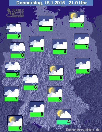 In der Nacht zum Freitag ziehen in einem breiten Streifen vom Südwesten und Westen bis in den Nordosten Deutschlands dichte Regenwolken, dabei fällt immer wieder, teils kräftiger Regen. Im Nordwesten bleiben die Wolken ebenfalls meist dicht, jedoch fällt hier nur selten Regen. Im Süden und Osten ist es neben starker Bewölkung auch zeitweise aufgelockert bewölkt, hier bleibt es weitgehend trocken. Die Temperatur sinkt auf 7 Grad in Stralsund und auf etwa 1 Grad in Augsburg. Der Wind weht besonders in der Nordhälfte noch häufig stark mit möglichen Sturmböen, auf den Bergen und an der See ist es teils stürmisch mit möglichen schweren Sturmböen.