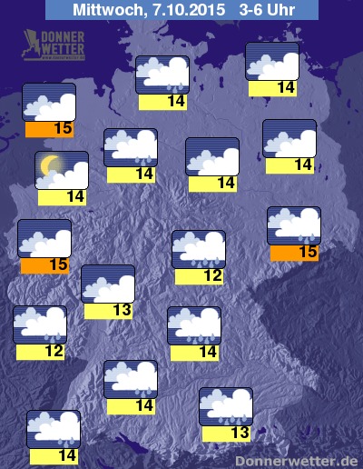 In der Nacht zum Mittwoch bleibt es über Deutschland bei einer überwiegend starken oder dichten Bewölkung, Auflockerungen sind am ehesten im Nordwesten und Westen möglich. Vor allem über Süddeutschland fällt verbreitet starker und langanhaltender Regen, sonst fällt in einem breiten Streifen zwischen Schleswig-Holstein bis nach Thüringen hinein zeitweise Regen. In den übrigen Landesteilen bleibt es zumeist trocken. Die Temperatur sinkt auf 15 Grad an der Nordsee und bis 12 Grad am Bodensee.