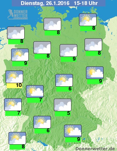 Heute Nachmittag halten sich vor allem im Norden überwiegend dichte Wolken, weiter nach Süden hin ist es häufig stark, hier und da aber auch mal aufgelockert bewölkt, dabei bleibt es landesweit weitgehend trocken. Im Süden ist es es auch oft heiter bis sonnig. Die Temperatur steigt auf 5 Grad im Vogtland und bis 10 Grad in Bonn.