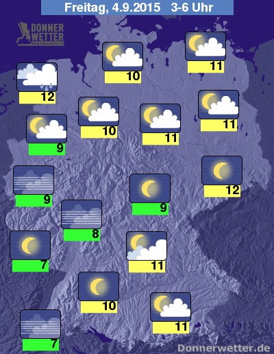 In der kommenden Nacht klingen die Niederschläge im Süden und Südosten Deutschlands, sowie in Sachsen nach und nach ab und bis zum Morgen lockert die Bewölkung hier häufig auf. Im Nordseeumfeld ziehen hingegen neue dichte Wolken auf und es fällt dazu zeitweise Regen. Im großen Rest des Landes zeigt sich hingegen ein meist locker bewölkter oder oft auch sternenklarer Nachthimmel. Die Temperatur sinkt auf 12 Grad in Emden und bis 7 Grad im Saargau.