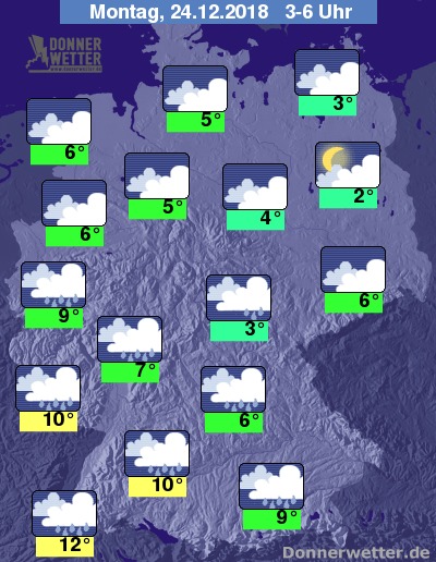 Am Montag halten sich über der Südwesthälfte der Republik dichte Wolken und es fällt wiederholt Regen. Dagegen ist es im Norden und Osten teils stark, teils auch gering bewölkt, dabei bleibt es trocken. Die Temperatur steigt auf 4 Grad in Vorpommern und bis 12 Grad im Breisgau.