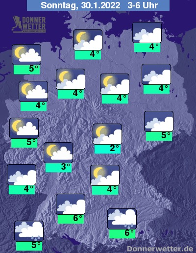 In der Nacht zum Sonntag fällt im Süden zunächst noch weiterhin gebietsweise Regen, der zum Morgen hin abklingt. Im übrigen Bundesgebiet ist es teils aufgelockert, teils stark bewölkt und es bleibt weitgehend trocken. Die Temperatur sinkt auf 6 Grad in Stuttgart und bis 2 Grad in Jena. An den Küsten herrscht vielerorts schwerer Sturm mit orkanartigen Böen. Über der Nordwesthälfte ist es meist stürmisch mit Sturmböen, im übrigen Land ist es teils stürmisch.