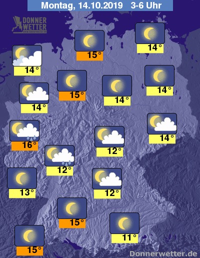 In der bevorstehenden Nacht ist es über dem Süden und Osten, vorübergehend auch über dem Norden sternenklar, jedoch ziehen im Westen und im Verlauf auch über den Norden gebietsweise dichte Wolken hinweg, dazu können sich einzelne Schauer entwickeln, sonst bleibt es trocken. Die Temperatur sinkt auf sehr milde 16 Grad in Köln und bis 11 Grad in Augsburg.