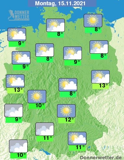 In der Nacht zum Montag hält sich im Süden noch oft dichte Bewölkung oder es ist hier neblig-trüb. Vor allem über der Nordhälfte des Landes ist es verbreitet gering bewölkt oder sternenklar, jedoch kann sich stellenweise Nebel oder Hochnebel bilden. Es bleibt überall trocken bei Tiefstwerten von 8 Grad in Freiburg und etwa 2 Grad in Hamburg.