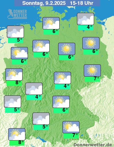 Am Sonntagnachmittag bleibt der Himmel über dem Norden sowie im Südwesten Deutschlands gebietsweise wolkig oder es ist stark bewölkt, dabei bleibt es aber meist trocken. In den übrigen Landesteilen ist es teils heiter bis wolkig, teils sonnig.