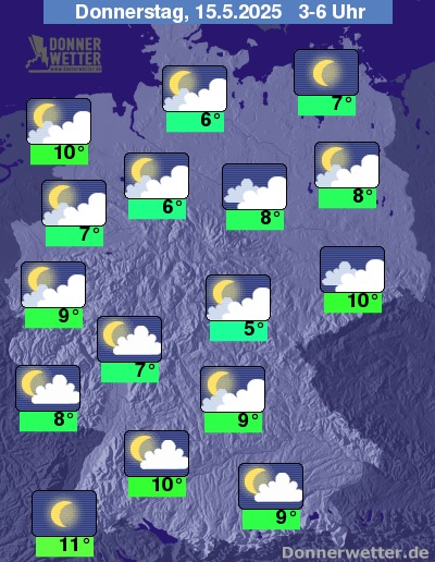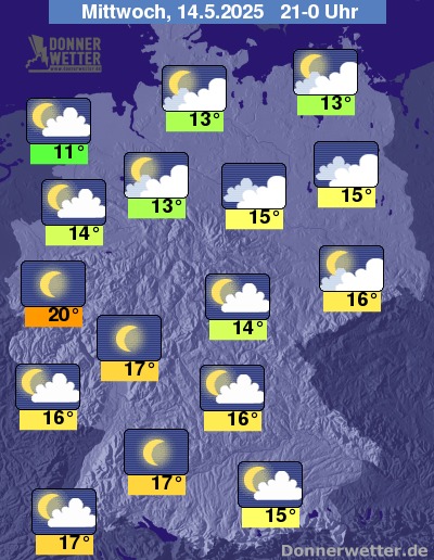 In der Nacht zum Donnerstag ist es vom Norden bis in die Landesmitte zeitweise stärker bewölkt, es bleibt aber meist niederschlagsfrei. In den übrigen Landesteilen dominiert geringe Bewölkung, teils ist es auch sternenklar, und es bleibt trocken.