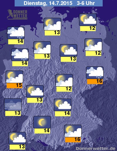 In der kommenden Nacht ist der Himmel im Süden zeitweise sternenklar, sonst dagegen teils locker, häufig auch stark bewölkt. Vor allem nach Nordwesten und im Osten fällt zeitweise Regen, sonst bleibt es meist trocken. Die Temperatur sinkt auf 16 Grad in München und bis 12 Grad an der Müritz.