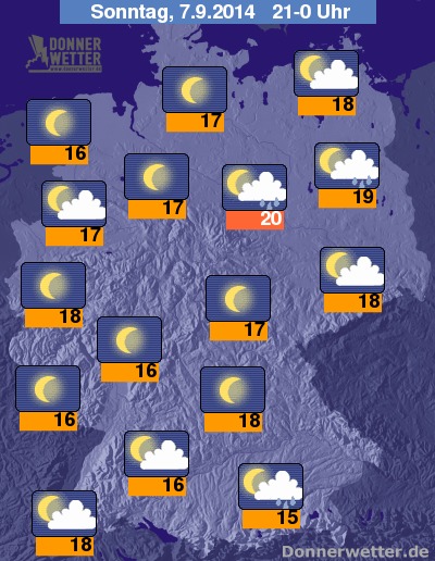 Heute Abend bilden sich von der Ostsee, über den Osten bis in den Südosten von Deutschland gebietsweise Schauer und Gewitter, dazwischen lockert es hier aber zeitweise auf, sonst zeigt sich der Himmel jedoch verbreitet sternenklar oder nur locker bewölkt und es bleibt trocken. Die Abendtemperatur liegt bei etwa 20 Grad in Magdeburg und 15 Grad am Alpenrand.