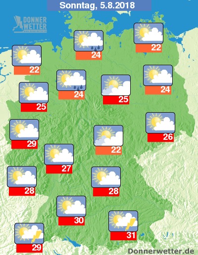 Am Sonntag ist es überwiegend heiter bis sonnig, am Alpenrand und im Norden ziehen gebietsweise auch dichte Wolken auf, dabei bilden sich vereinzelt Schauer oder Gewitter, sonst bleibt es aber weiterhin trocken. Die Temperatur steigt auf rund 22 Grad an den Küsten und bis 31 Grad in München.