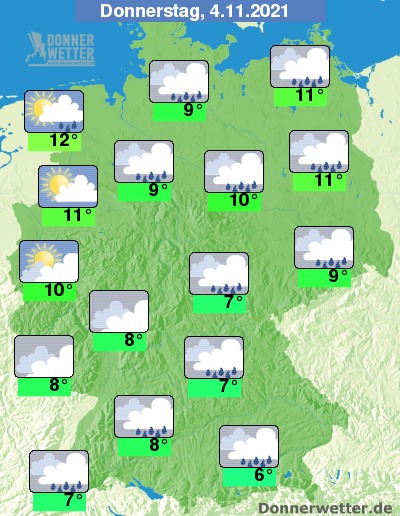 Am Donnerstag bleibt es über der Südosthälfte des Landes bedeckt und es fällt zeitweise Regen. Im übrigen Bundesgebiet ist es meist stark bewölkt, dabei bilden sich nur vereinzelt Schauer. Vom Nordseeumfeld bis zum Münsterland ist es oft heiter und trocken. Die Temperatur steigt auf 6 Grad in München und bis 12 Grad in Cuxhaven.