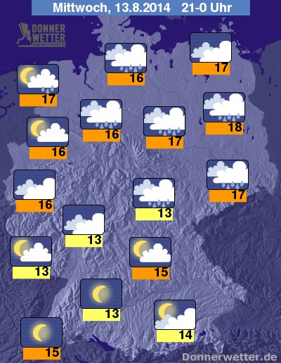 In der Nacht zum Donnerstag ziehen sich die dichten Regenwolken immer weiter nach Osten zurück. Gegen Morgen regnet es voraussichtlich nur noch im Raum Berlin-Brandenburg, sonst lockert der Himmel während der Nacht verbreitet auf, vielerorts wird es sternenklar. Die Temperatur sinkt auf 15 Grad in Dresden und kühle 9 Grad im Spessart.
