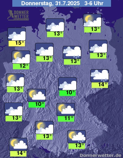 In der Nacht zum Donnerstag ziehen vor allem im Norden und Osten kompakte Wolken mit Schauern durch, teils kann es auch kurz gewittern. Weiter nach Südwesten hin ist es auch oft stark, teils aber auch nur locker bewölkt, hier bilden sich seltener Schauer. Die Tiefstwerte liegen bei 15 Grad in Emden und bis 10 Grad in Jena.