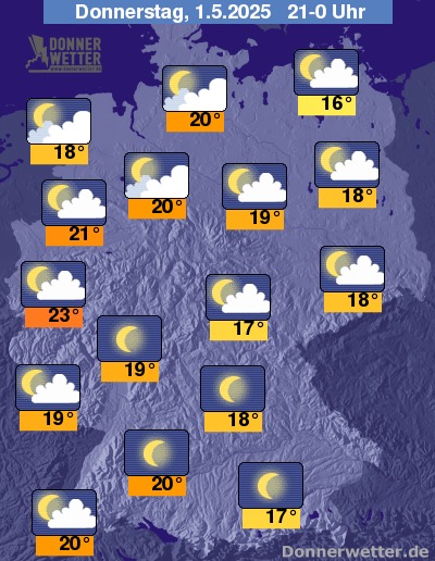 Zum Abend hin verdichten sich die Wolken im Nordwesten; in den übrigen Landesteilen ist es teils sternenklar, teils gering bewölkt. Es bleibt trocken.