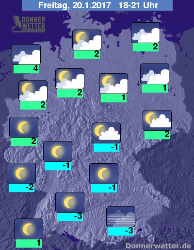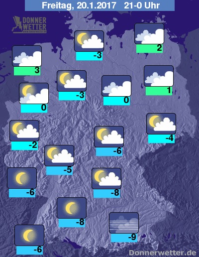 Tiefstwerte in der ersten Nachthälfte um 3 bis -9 Grad C.