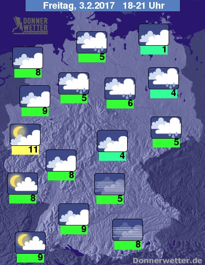 Heute Abend bleibt es über Deutschland größtenteils dicht bewölkt, dazu fällt im Norden und Osten zeitweise Regen. Weiter nach Südwesten hin bleibt es hingegen weitgehend trocken. Im Westen und Südwesten der Republik lockert die Bewölkung auch über weiten Teilen auf. Die Abendwerte liegen bei 1 Grad in Rostock und um 11 Grad im Rheinland.