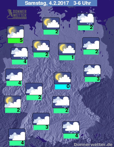 In der Nacht zum Samstag zieht sich der Regen in den äußeren Norden, Nordosten und Osten des Landes zurück. Gebietsweise regnerisch bei dichten Wolken ist es auch im Alpenvorland sowie am Niederrhein. In den übrigen Landesteilen ist es mehrheitlich stark, hier und da aber auch nur locker bewölkt und weitgehend trocken. Die Temperatur sinkt auf 5 Grad im nördlichen Emsland und bis 0 Grad im Thüringer Becken.