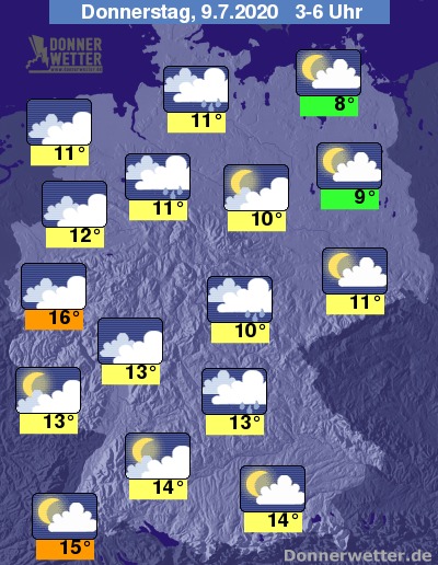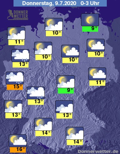 In der Nacht auf Donnerstag zeigt sich der Himmel über weiten Landesteilen wechselnd oder stark bewölkt, nur entlang der Oder dominiert lockere Bewölkung. Regional muss in der Nacht mit Schauern gerechnet werden, zunächst vor allem in der Westhälfte, in den frühen Morgenstunden dann hauptsächlich an der Weser sowie in den südöstlichen Mittelgebirgen.