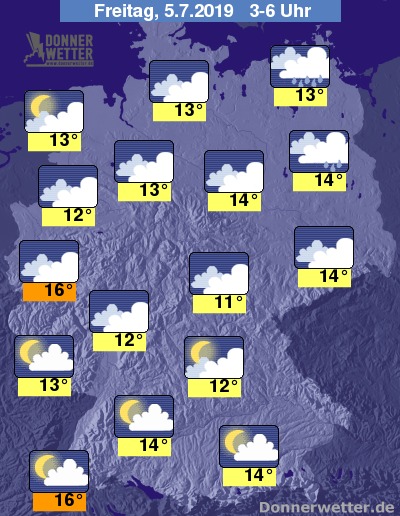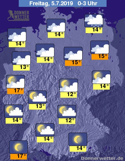 Die Temperaturen sinken in der Nacht auf Werte um 16 Grad im Rheinland und um 11 Grad im Thüringer Wald.