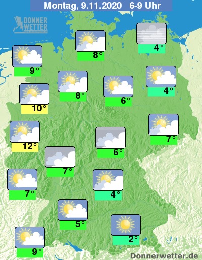 Die Temperaturen gehen auf Werte um 12 Grad in der Kölner Bucht und 2 Grad am Alpenrand zurück.
