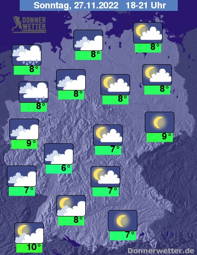Heute Abend ist es über der Westhälfte wolkenverhangen und vom Niederrhein bis zur Nordsee fällt vielerorts Regen. Über der Osthälfte ist es meist locker bis aufgelockert, gebietsweise aber auch stark bewölkt, dazu bleibt es trocken. Die Temperatur liegt bei 6 Grad in Wiesbaden und etwa 10 Grad in Freiburg.