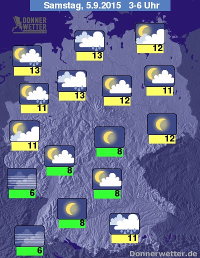 In der bevorstehenden Nacht ist es im Alpenvorland oft bedeckt und es fällt zeitweise Regen, sonst ist es im Süden und Osten des Landes aber verbreitet sternenklar und dazu trocken. Im Norden und Westen ist es anfangs auch oft locker bewölkt und trocken, im Laufe der Nacht kommen jedoch häufig dichte Wolken auf und es fällt gebietsweise Regen. Die Temperatur sinkt auf 13 Grad in Hamburg und bis 6 Grad in Konstanz.
