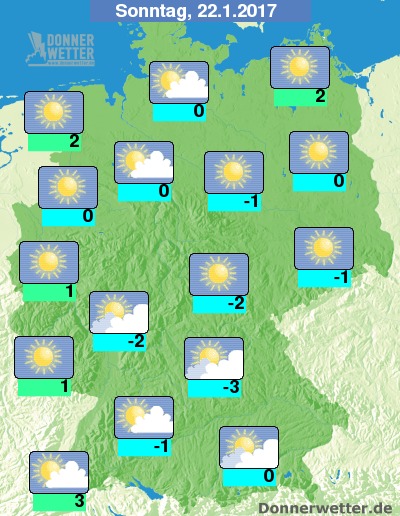 Die Temperaturen erreichen im Tagesverlauf Höchstwerte um -3 Grad C im Altmühltal und um +2 Grad C an der Ostseeküste.