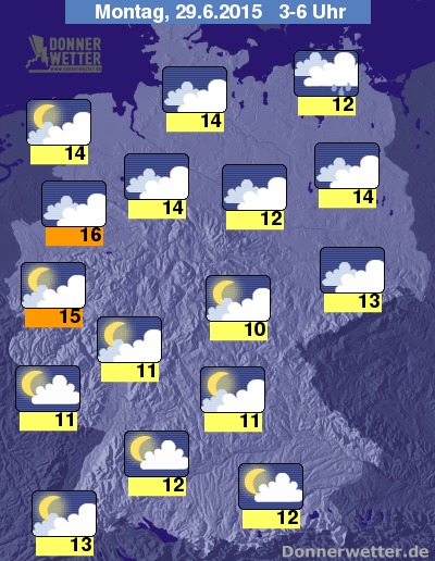 In der bevorstehenden Nacht bleiben die Wolken im Norden und Osten verbreitet dicht, dazu kann gelegentlich auch Regen fallen. Weiter nach Süden und Westen hin zeigt sich der Himmel hingegen meist locker oder aufgelockert bewölkt und es bleibt trocken. Die Temperatur sinkt auf 16 Grad am Niederrhein und bis 10 Grad im Eichsfeld.