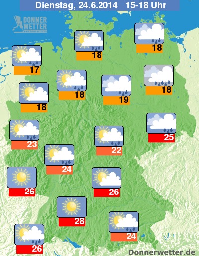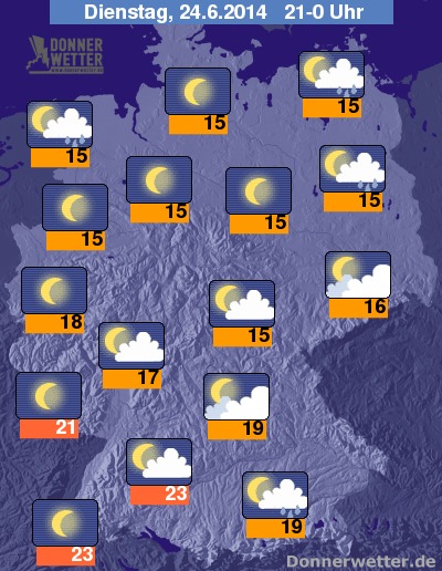 Am Abend halten sich besonders in der Nordosthälfte noch oft dichte Wolken aus denen sich weitere Schauer bilden können, die Gewitterneigung lässt dabei spürbar nach. Nach Westen und Süden wird es zunehmend freundlicher und die Bewölkung lockert mehr und mehr auf und es bleibt überwiegend trocken. Die Abendwerte liegen bei teils sehr milden 23 Grad am Oberrhein und verbreitet 15 Grad in Norddeutschland.