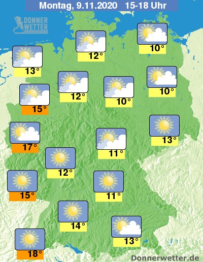 Im Nachmittagsverlauf machen die Wolken im Süden des Landes immer häufiger der Sonne Platz; im norddeutschen Tiefland ist der Himmel teils heiter bis wolkig, teils aufgelockert bewölkt.
