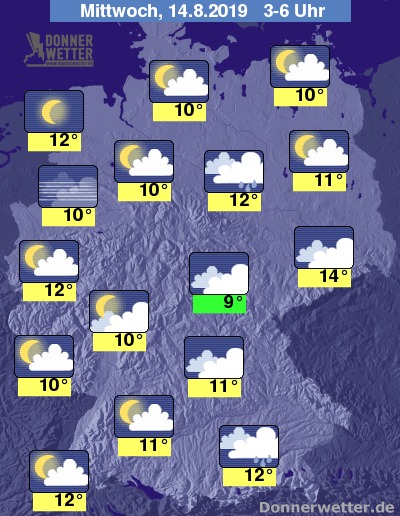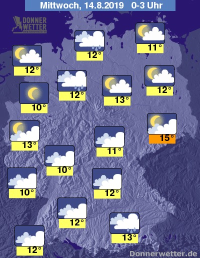 Im weiteren Nachtverlauf lockern die Wolken dann auch über weiten Teilen der Südhälfte weiter auf, geschlossen bleibt die Wolkendecke dann meist nur noch in der Südosthälfte und Teilen der Mitte. In der Altmark und an den Alpen können vereinzelt Schauer fallen, sonst ist es meist trocken.