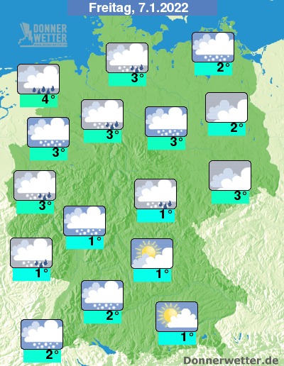 Am Freitag ziehen größtenteils dichte Wolken durch, lediglich im Südosten ist es anfangs noch oft aufgelockert bewölkt. Von Nordwesten her setzt zeitweise Schneefall, zum Teil auch Regen ein, der sich weiter nach Südosten hin ausbreiten. Im Osten und Südosten bleibt es bis zum Abend noch weitgehend trocken. Oft ist es jedoch auch neblig-trüb. Die Temperatur steigt auf 1 Grad in Mittelfranken und bis 4 Grad an der Nordsee.