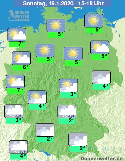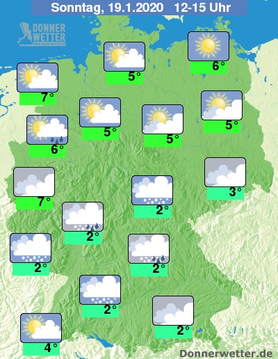 Im Nachmittagsverlauf lockern die Wolken im Westen und der Landesmitte auf. Über der gesamten Nordhälfte Deutschlands ist es dann heiter bis wolkig, an Weser und Elbe auch sonnig, und es bleibt trocken. Südlich des Mains bleibt der Himmel in den Nachmittagsstunden meist bedeckt und zeitweise muss mit Niederschlägen gerechnet werden, die in höheren Lagen auch als Schneeregen oder Schnee fallen können.