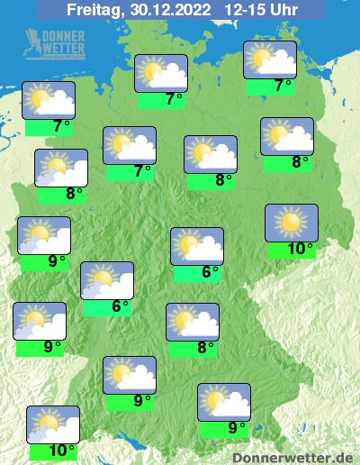 Heute Nachmittag scheint vor allem über der Osthälfte Deutschlands noch häufig die Sonne. Weiter nach Westen hin werden die Wolken dagegen zunehmend zahlreicher und dichter, jedoch bleibt es noch landesweit trocken. Die Temperatur liegt bei 6 Grad im Vogtland und 10 Grad im Breisgau. Im Norden und Westen weht ein oft starker bis stürmischer Wind. An der Nordsee herrscht Sturm.