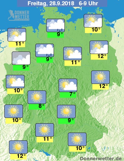 Der Freitag startet dann im Norden wechselnd oder stark bewölkt, entlang der Weser können auch einzelne Schauer fallen. Südlich des Mains gibt es bereits in den Morgenstunden viel Sonnenschein.