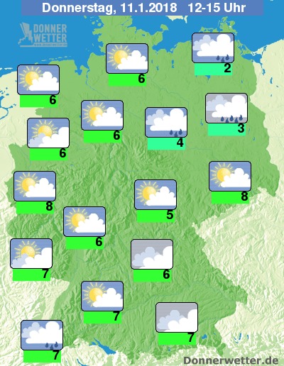 Über Mittag präsentiert sich das Wetter durchaus abwechslungsreich. Während es vor allem im Nordosten sowie im äußersten Südwesten vereinzelt leicht regnet, kommt im Rest des Landes verbreitet die Sonne zum Vorschein. Dies trifft vor allem auf die breite Mitte und die Regionen Bremen und Hamburg zu.