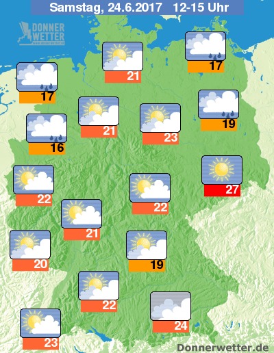 Heute Abend zeigt sich der Norden weitgehend bedeckt und hier fällt gebietsweise Regen, weiter nach Süden hin ist es hingegen verbreitet heiter oder sonnig und trocken. Einzelne Schauer sind in NRW jedoch zu erwarten, sonst bleibt es weitgehend trocken. Die Temperatur liegt bei frischen 17 Grad in Stralsund und bis 27 Grad in Dresden.