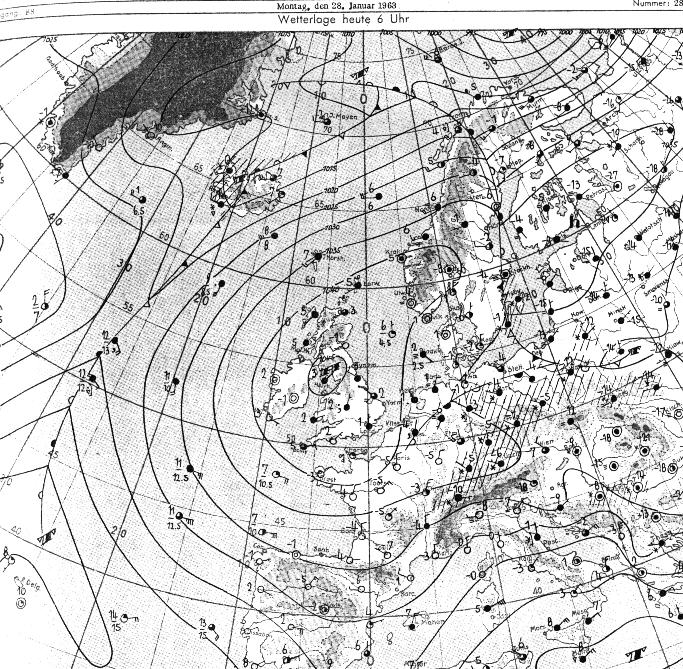 Die Ursache für die starke Schwankungen liegt an der Veränderung der Großwetterlage. In der Atmosphäre gibt es vereinfacht dargestellt drei Großwettersituationen. Bei einer starken West- oder Südwestströmung bestimmt der Atlantik das Wetter. Viele Tiefdruckgebiete ziehen vom Atlantik nach Mittel- und Osteuropa und bringen warme Luft bis tief nach Rußland. Auch in diesem Winter haben wir diese Situation. Bei extremen Wetterlagen können selbst im Januar 15-17 Grad am Rhein gemessen werden ! Die zweite Großwetterlage ist kontinentaler Prägung. Große Hochdruckgebiete bestimmen das Wetter in Europa. Der Tiefdruckeinfluß kommt kaum zur Geltung. Warme Luft kann sich nicht nach Osten ausbreiten. Kalte Luft kommt aber immer wieder nach Westen voran. Die Temperaturen können dann auf unter -30 Grad im Osten unseres Land absinken. Auf der Wetterkarte ist die Wetterlage Ende Januar 1963 dargestellt. Ein Riesenhoch erstreckt sich über ganz Europa. Tiefs spielen auf der Wetterkarte kaum eine Rolle. Die am häufigsten anzufindene Großwetterlage ist eine Mischform aus den ersten beiden. Der Winterverlauf in Deutschland hängt entscheidend von der Großwetterlage ab. Für den weiteren Winterverlauf 98 bis Mitte Februar ist nicht mit einer Änderung der Großwetterlage zu rechnen.
