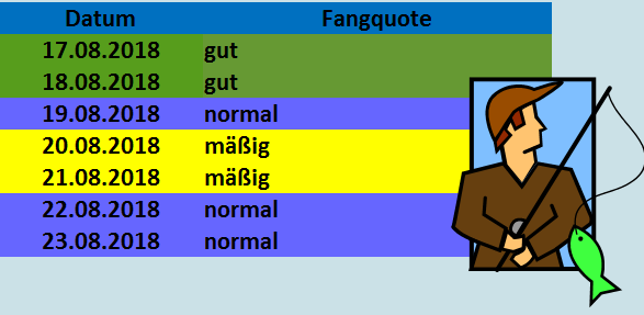 Wer sich bessere Fangquoten wünscht, sollte auf bedeckte und kühlere Wetterlagen warten. Den am Wochenende stehen wieder 20 Grad C mit viel Sonne an. Auch die kommende Woche fällt ähnlich aus.