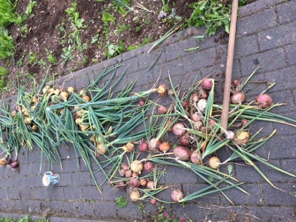 Nach der Pflanzung der Zwiebeln im April oder Mai sind die Lauchgewächse, nach Abknicken und Eintrocknen des Laubs, ab August lagerfähig. Bevor es aber ins Lager geht, sollte die Pflanze, wie auf unserem Bild, noch einige Tage zum Trocknen ausgelegt und regelmäßig gedreht werden. So trocknen die äußeren Schichten der Zwiebel ab und die Haltbarkeit im Lager wird verlängert.