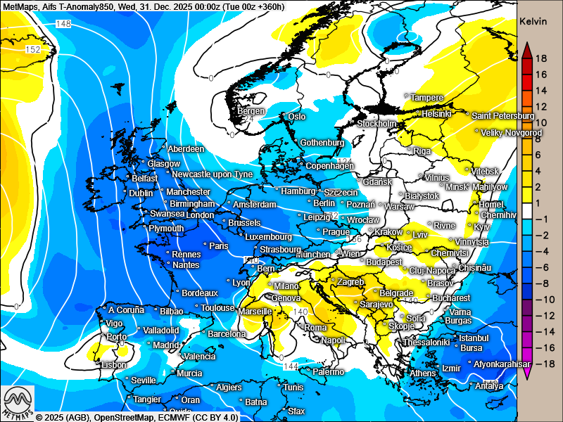 Die Temperaturabweichung in 850 hPa sowie die Wetterkarte für die Nacht auf dem 31. Dezember nach AIFS:
